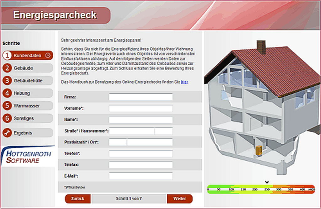 Hier können Sie online eine Analyse Ihres Gebäudes durchführen und gelangen so in wenigen Schritten direkt zur Bewertung Ihres Gebäude-Energiebedarfs (nach EnEV Verfahren).Zum Online-Energiecheck